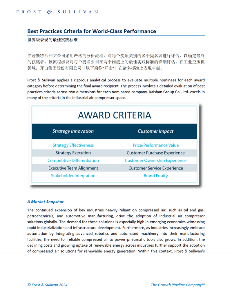 Frost & Sullivan對(duì)開山獲得“全球工業(yè)壓縮機(jī)競(jìng)爭(zhēng)戰(zhàn)略領(lǐng)導(dǎo)獎(jiǎng)”的頒獎(jiǎng)詞