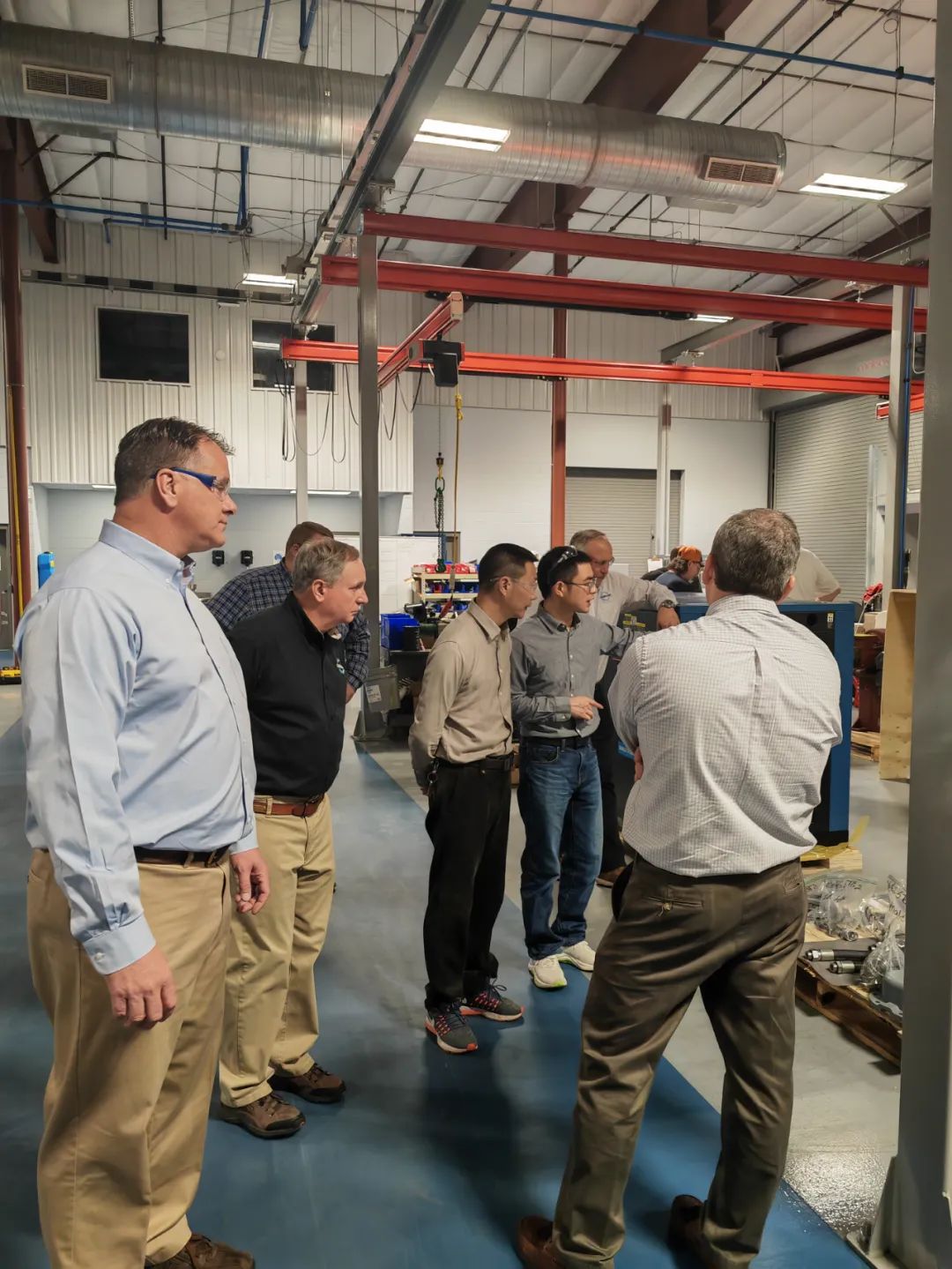 KCA總裁Keith先生和他的同事們熱情接待了來自中國的開山同事,中美兩個團隊就新產品開發、進一步提高運營效率、進一步做好品管工作等話題進行了充分的交流,取得了良好的成效。開山團隊還與干式無油螺桿空氣壓縮機研發中心工程師進行了深入交流,并參觀了干式無油螺桿空氣壓縮機生產線。